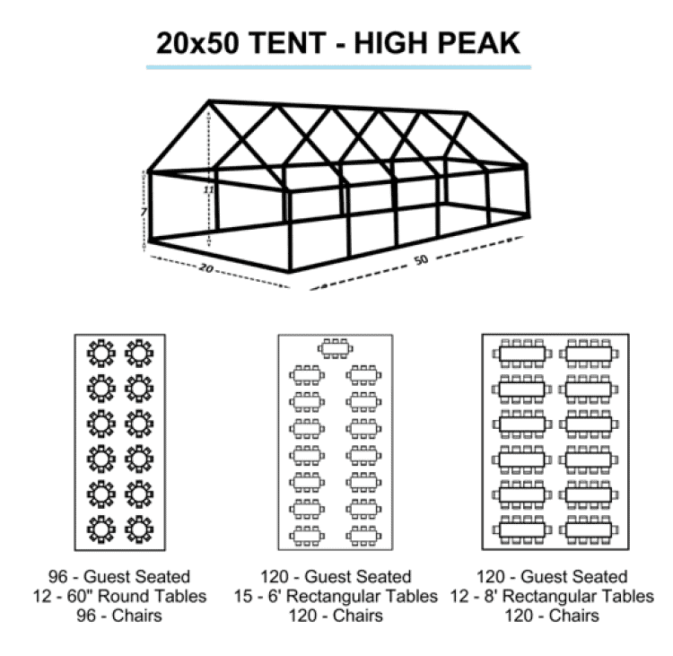 This combination uses a high peak tent 20x20 attached to a high peak tent 20x30. These two tents together make a high peak tent 20x50.